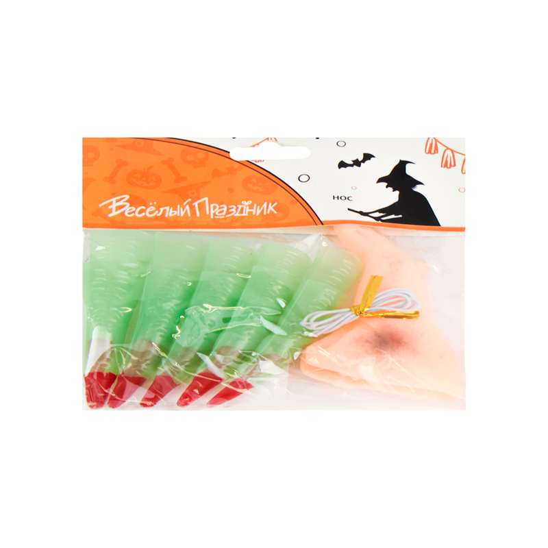 Изделия изготовлены из гибкой и безопасной пластмассы, которая не натирает кожу. Наденьте нос и пальцы — и вы instantly превратитесь в самую настоящую хозяйку темных сил!
