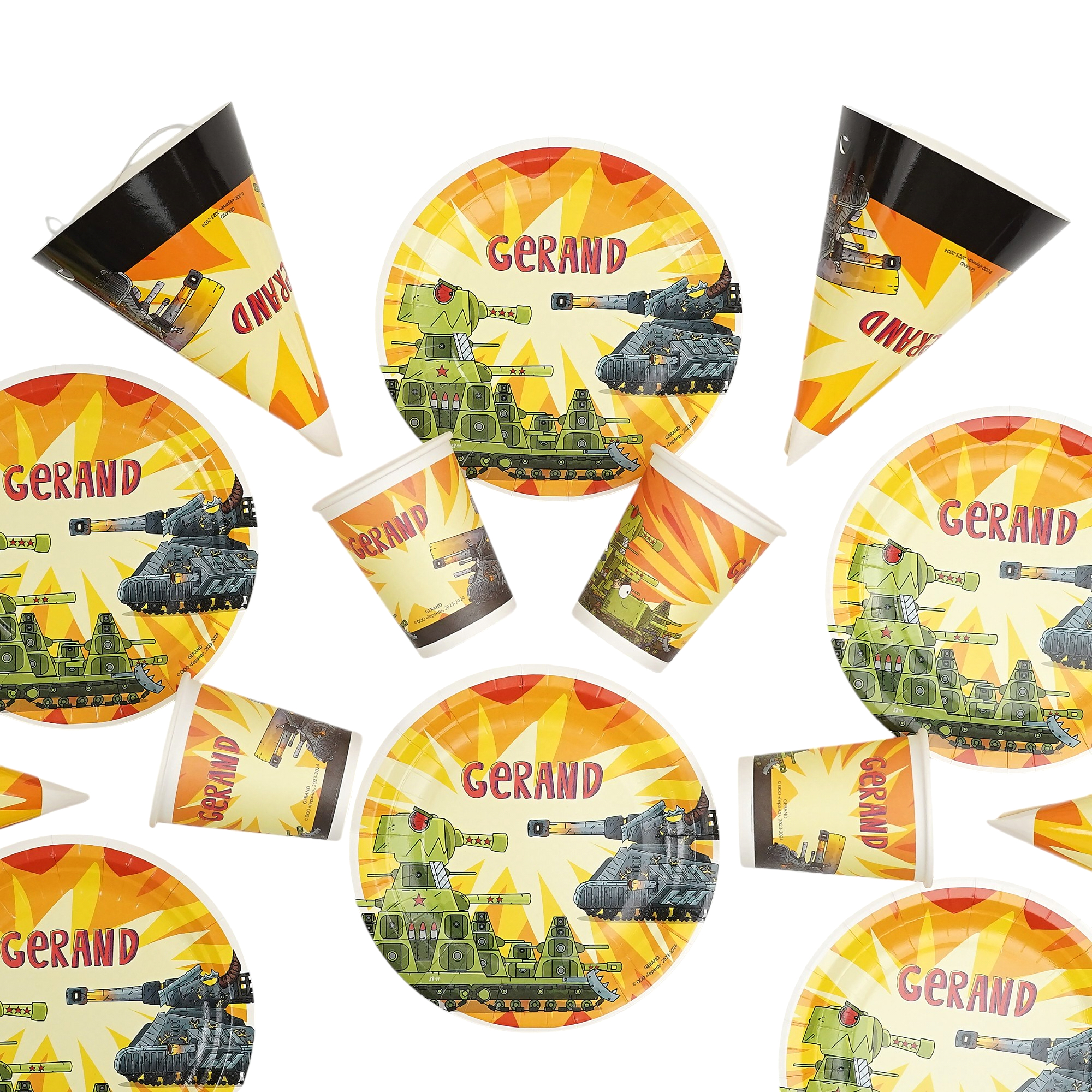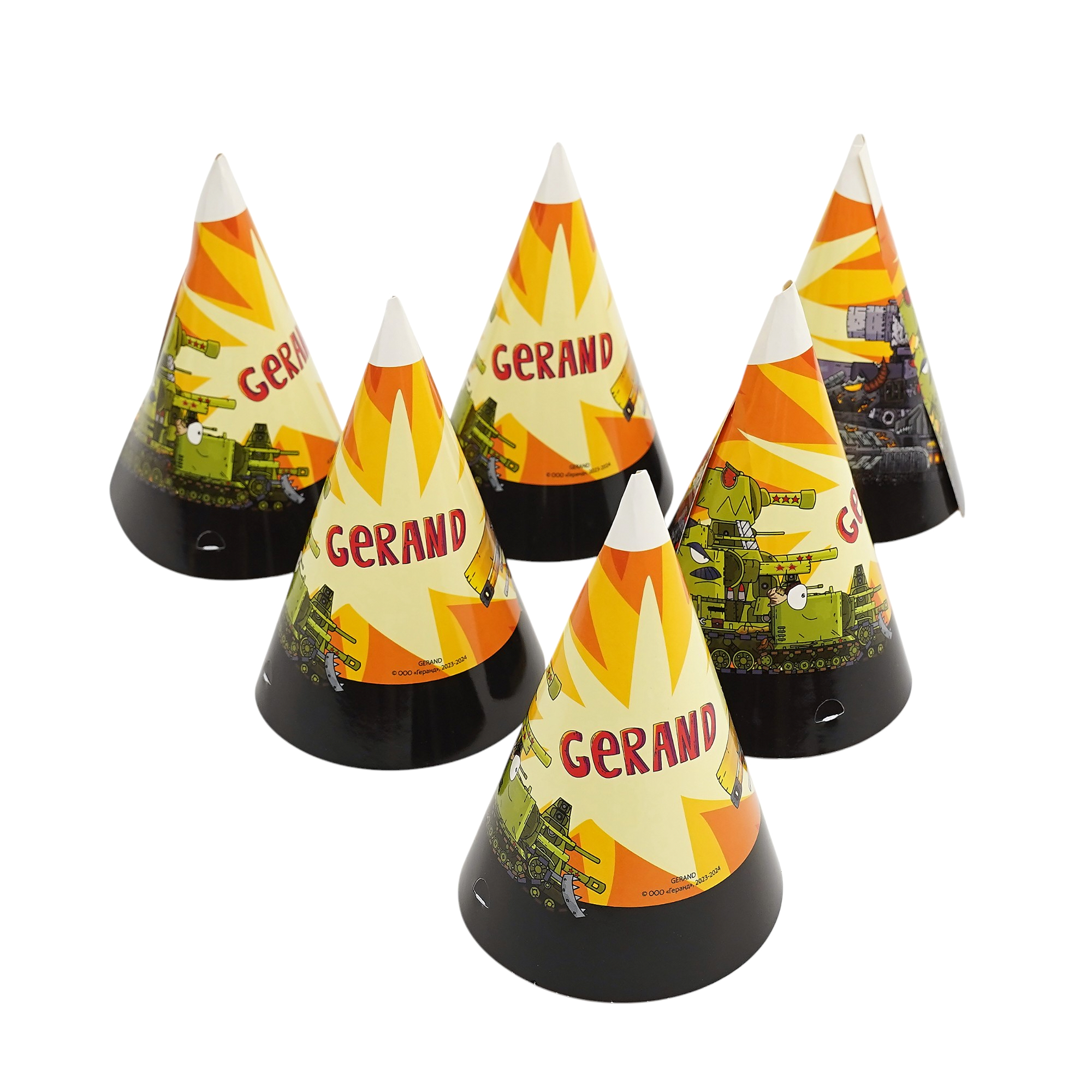 «Gerand» (Геранд) - мультсериал рассказывающий о приключениях  танка КВ-44. Оформите праздничный стол в стиле мультсериала «Gerand». Коллекция посуды представлена яркими тарелками и стаканчиками, для фото можно взять гудки и надеть праздничные колпачки. Праздник станет ярче, если дополнить его различными атрибутами. Колпачки «Gerand» идеально подойдут для неожиданного поздравления именинника, а фотосессия бумажными колпаками непременно станет эффектной! Набор: 6 штук. Состав: бумага ламинированная. Высота: 16 см. Диаметр: 11 см.  |