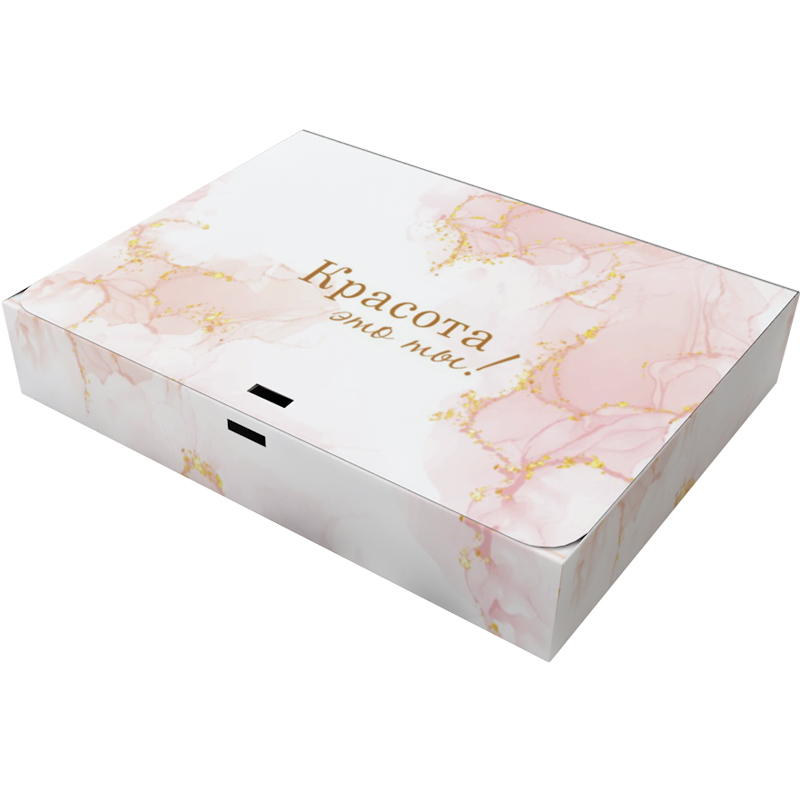 На крышке коробки искусно изображена надпись "Красота - это ты!", которая вдохновляет на позитивные мысли и подчеркивает индивидуальность каждого, кто получает такой дар. Лента, окутывающая коробку, выполнена из мягкого атласа и добавляет элегантности, создавая атмосферу торжества.