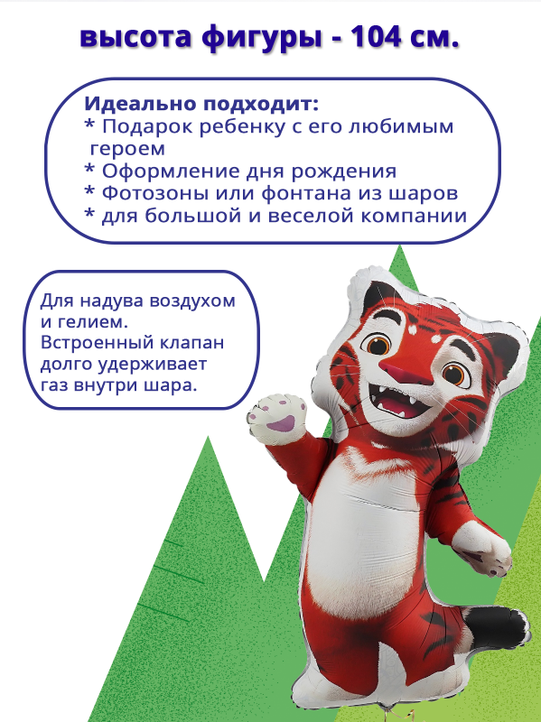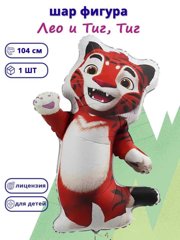 Фольгированный воздушный шар с героями популярного мультфильма Лео и Тиг. Тиг - приятный сюрприз любителям познавательного мультфильма. Может использоваться в качестве самостоятельного подарка или в составе фонтана из шаров, подходит для оформления детских праздников. Имеет встроенный клапан, который позволяет гелию оставаться внутри шара длительное время, продлевая срок полета до трех-четырех недель.