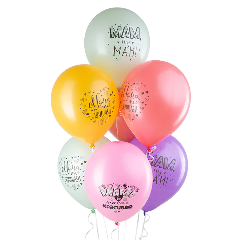 Надписи на воздушных шарах: "Мама, ты лучшая", "Мама, ты такая красивая", "Мам, ну мам".