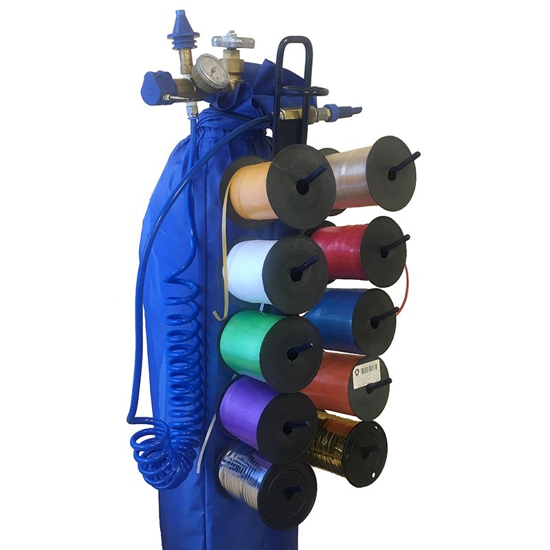 Накопитель для ленты, для 10 бобин с креплениями на баллон. Выполнен из крепкого металлического прута. Окрашен масляной краской синего цвета. Подвешивается непосредственно на баллон с гелием при помощи специального крепежа, что обеспечивает комфортную работу при надувании шаров.