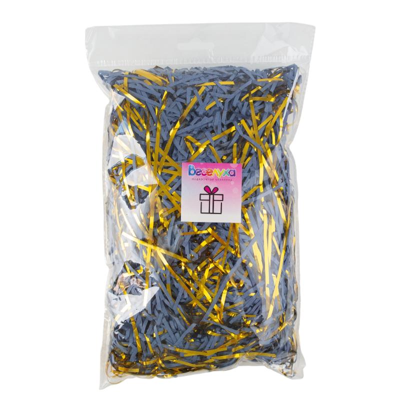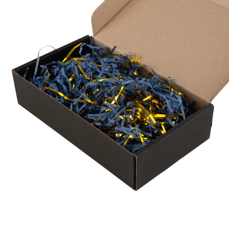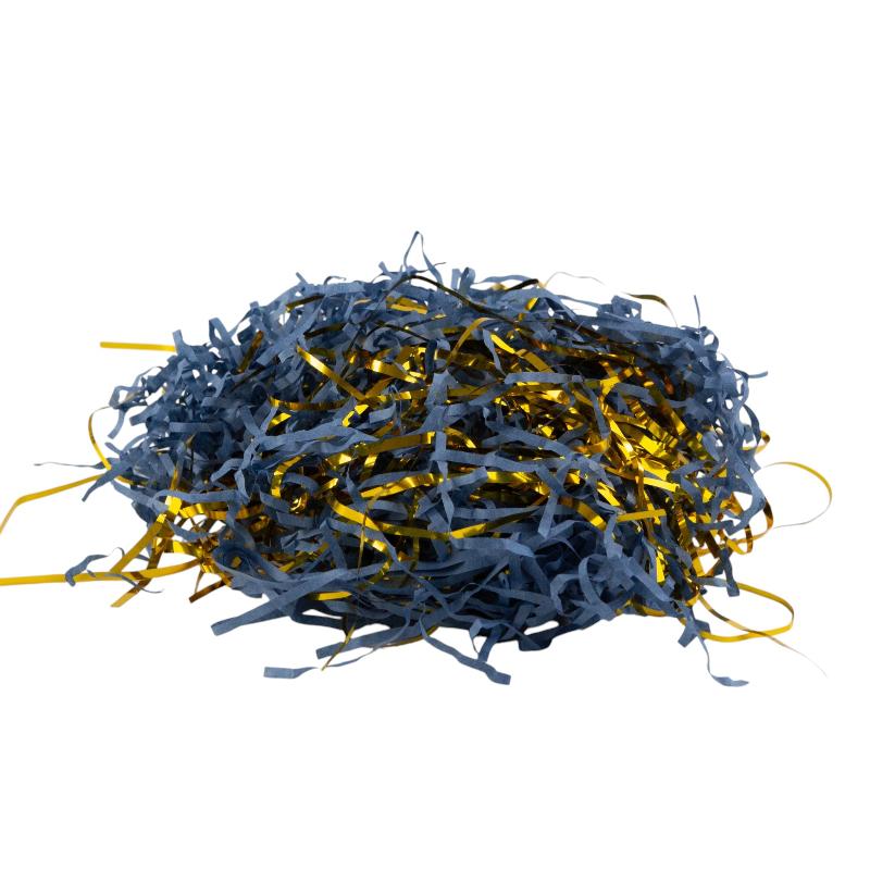 Наполнитель для коробок Бумажный и Металлический Синий-Золотой используется для создания привлекательного фона для подарков, может служить в качестве дополнительного декора при создании флористических или интерьерных композиций.