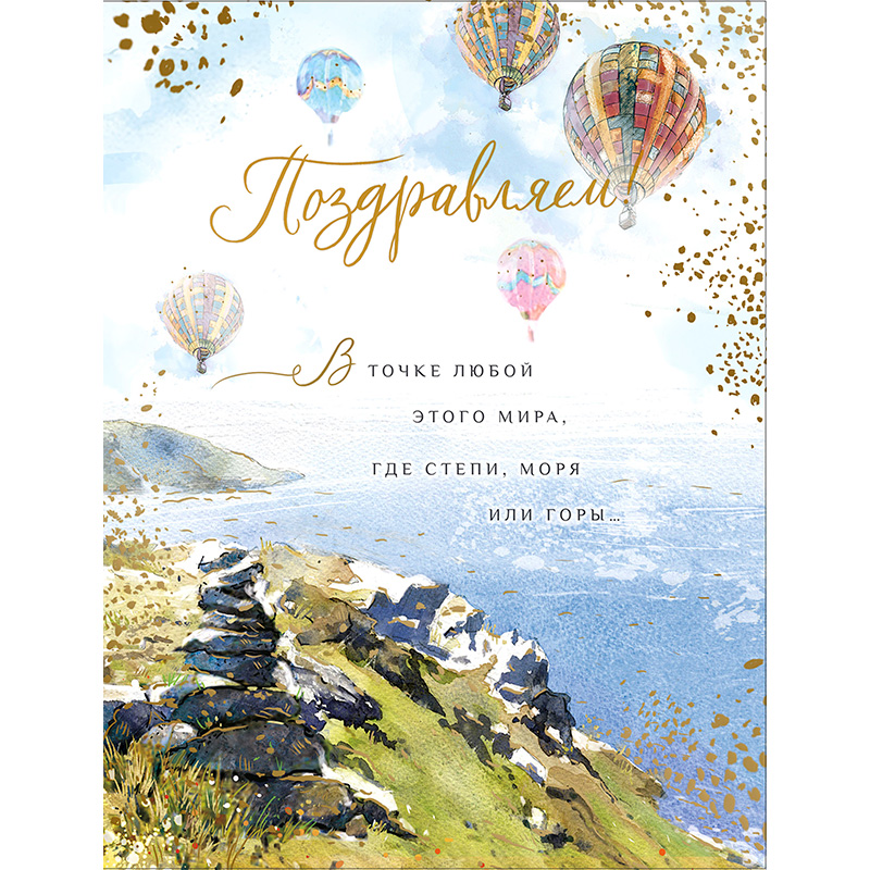 Эта открытка – идеальный способ пожелать чего-то особенного. Сочетание бескрайнего моря, могучих гор и легких воздушных шаров создает атмосферу свободы, спокойствия и безграничных перспектив.