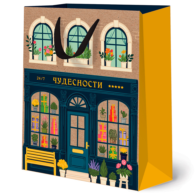 Этот пакет – не просто упаковка, а маленькое произведение искусства, которое само по себе уже дарит предвкушение праздника. На нем изображена очаровательная витрина магазина, где изящно расположились цветы и разнообразные подарки. Каждый штрих рисунка наполнен теплом и заботой, создавая атмосферу волшебства и предвкушения чего-то особенного.