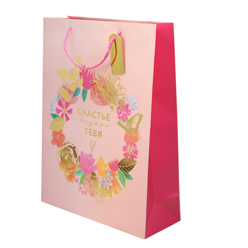 Снаружи пакет покрыт глянцевой ламинацией, что придает ему прочность, а изображению - яркость и насыщенность. Для придания дополнительного блеска на пакете есть элементы с тиснением фольгой