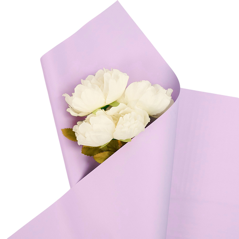 Матовая плёнка прекрасно зарекомендовала себя в работе: она пластичная, но при этом прочная и влагостойкая. Плёнка имеет толщину 50 микрон, является хорошим аналогом корейской пленки. Она удобна в работе - не скользит в руках, прочна и хорошо держит форму. Вместе с матовой плёнкой часто используют Бумагу Тишью, Ленты Атлас.