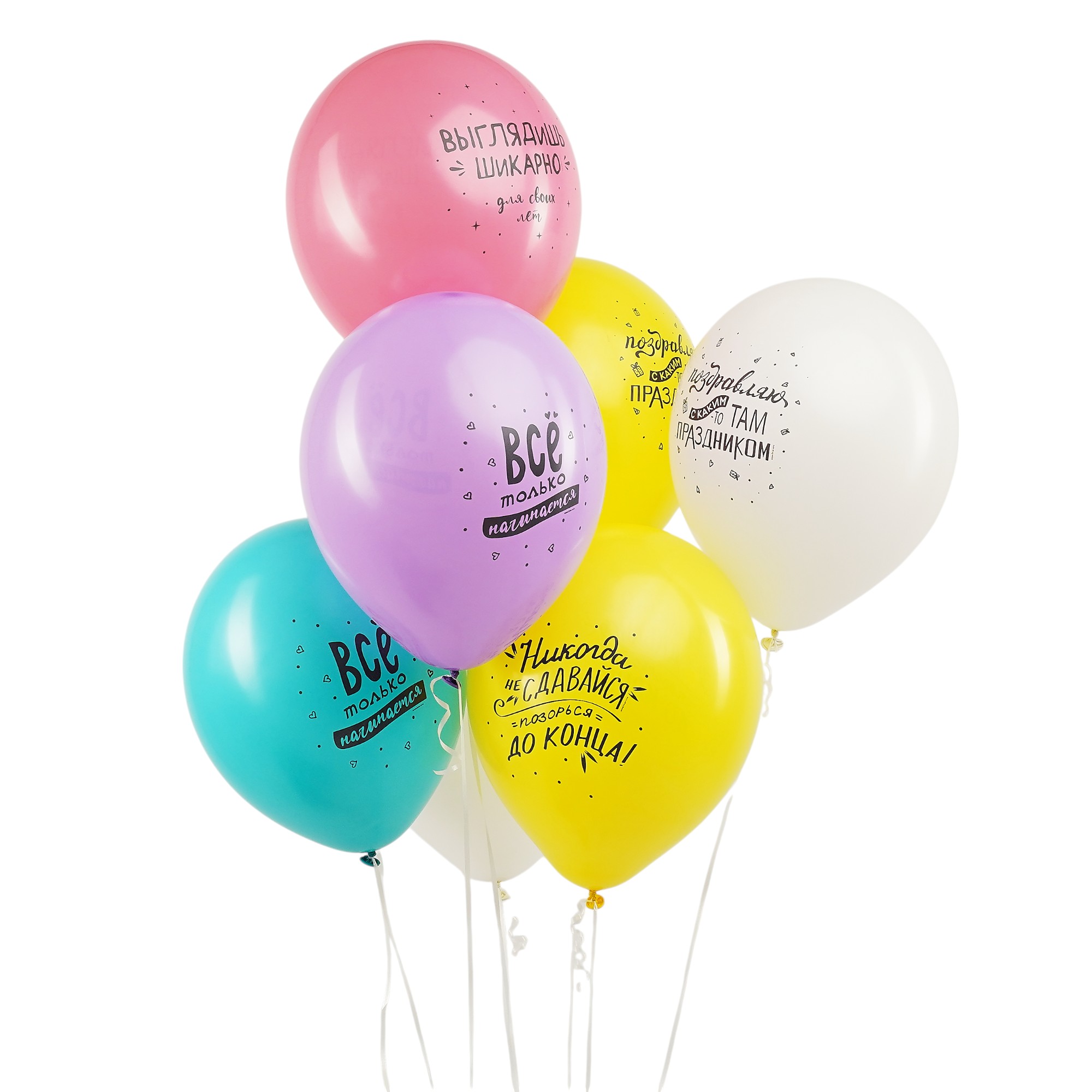 Надписи на воздушных шарах: "Поздравляю с каким-то там праздником", "Выглядишь шикарно для своих лет", "Все только начинается", "Никогда не сдавайся, позорься до конца".