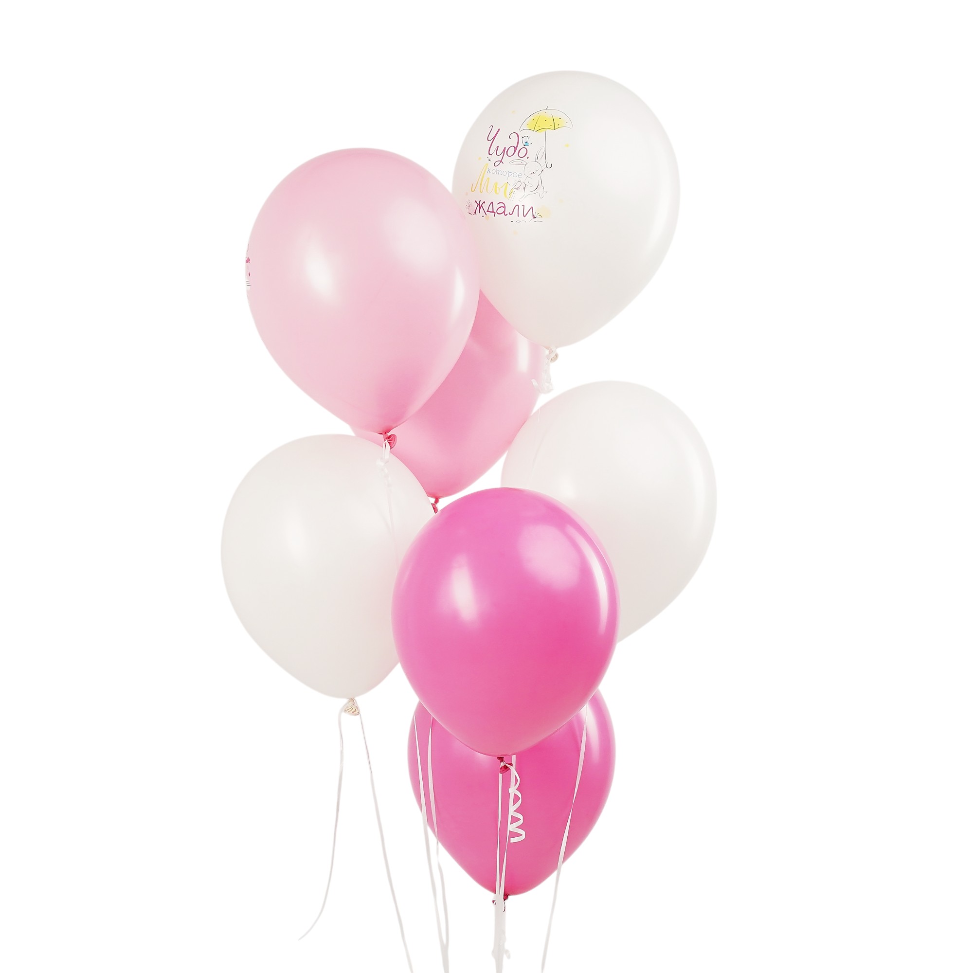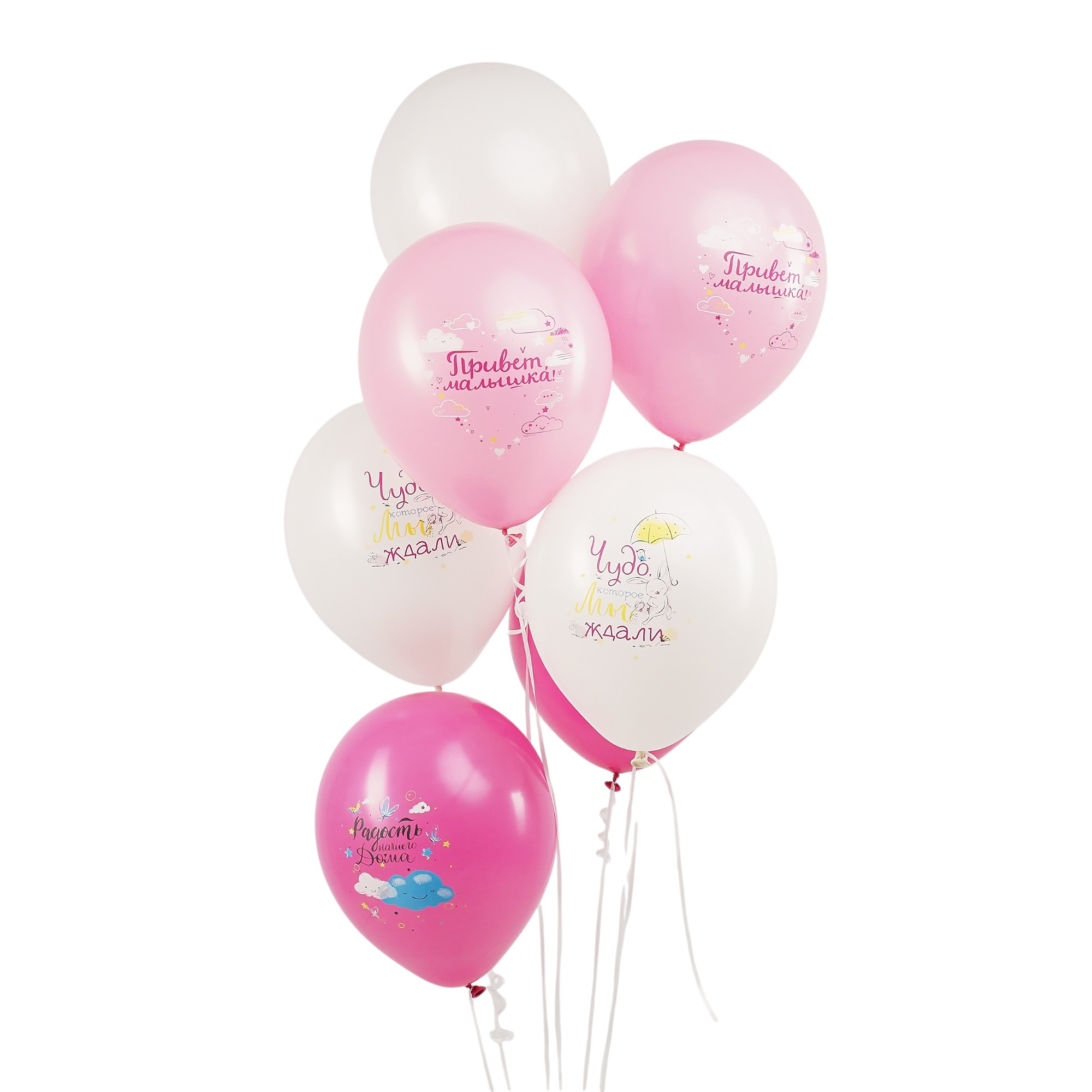 Надписи на воздушных шарах: "Чудо, которое мы ждали", "Радость нашего дома", "Привет, малышка!".