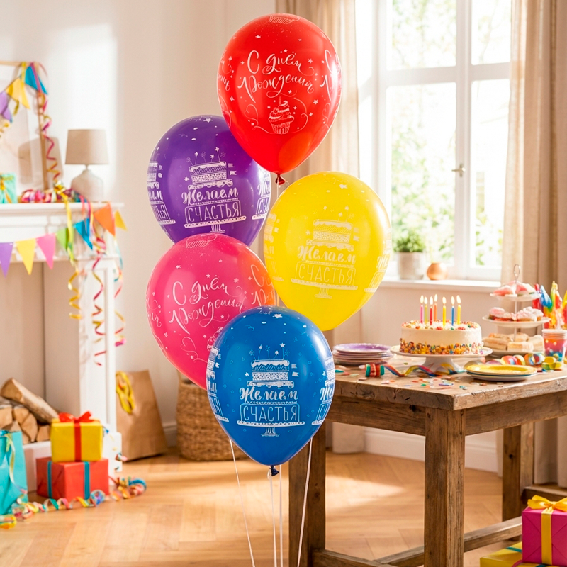 Набор содержит 3 дизайна с печатью в один цвет с пяти сторон Надписи на шарах: "С Днем рождения", "Желаем счастья". Палитра шаров: красный, желтый, оранжевый, фуксия, розовый, синий, голубой, аквамарин, лайм, лаванда. Латексные шары ТМ «Decobal» производятся во Вьетнаме, фабрика Decomex. Изготовитель успешно производит латексные шары с 1980 года и поставляет свою продукцию на рынок Азии и Европы.