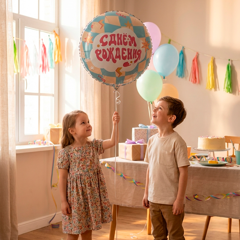 Сочетайте с фольгированными или латексными шарами, либо используйте вместо открытки. Имеет встроенный клапан, который позволяет гелию оставаться внутри шара длительное время.