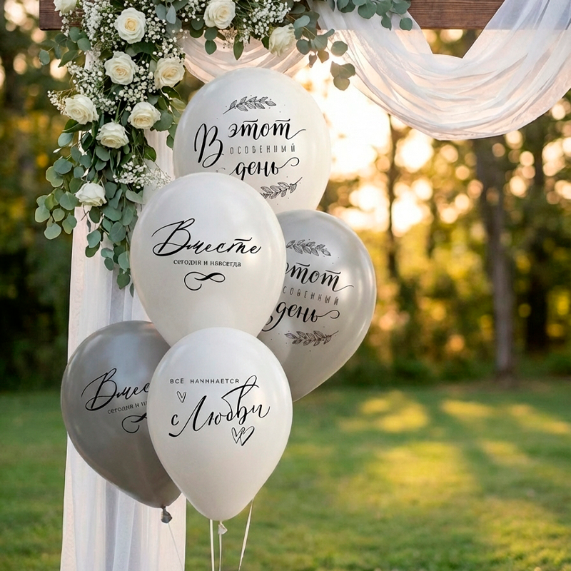 Надписи на воздушных шарах: "В этот особенный день", "Все начинается с любви", «Вместе сегодня и навсегда»
