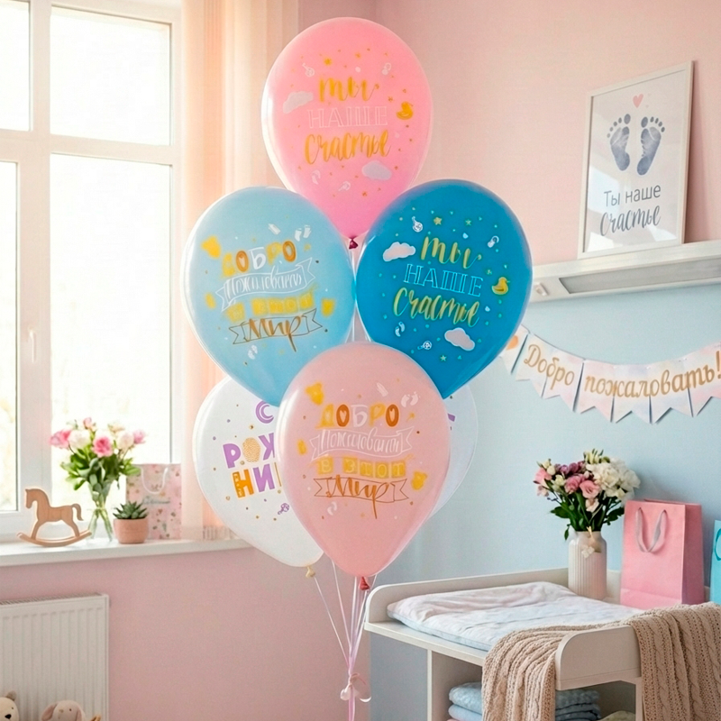 Надписи на воздушных шарах: "С Рождением!", "Добро пожаловать в этот мир", "Ты наше счастье"