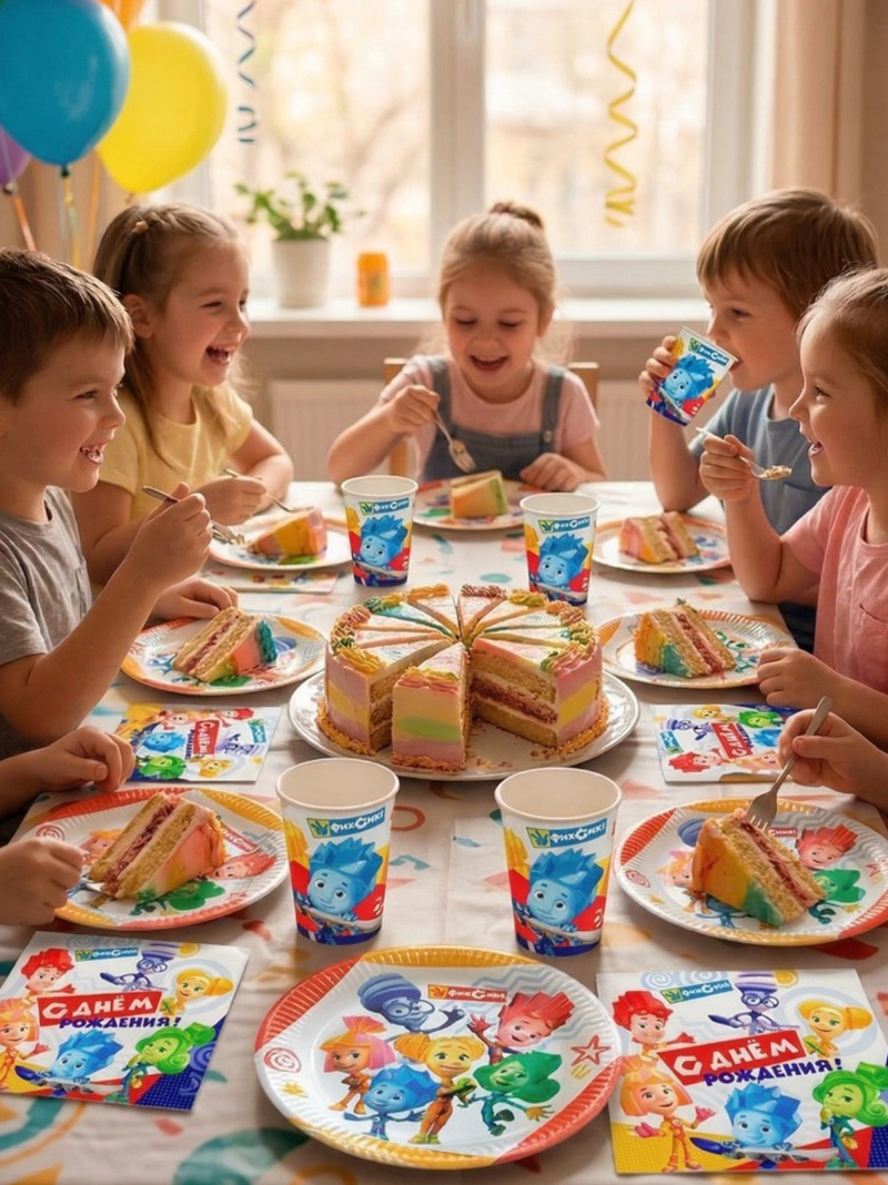 Оформите праздничный стол в стиле мультсериала «Фиксики» . Коллекция посуды представлена яркими тарелками и стаканчики, салфетками, скатертью, для фото можно взять гудки и надеть праздничные колпачки.