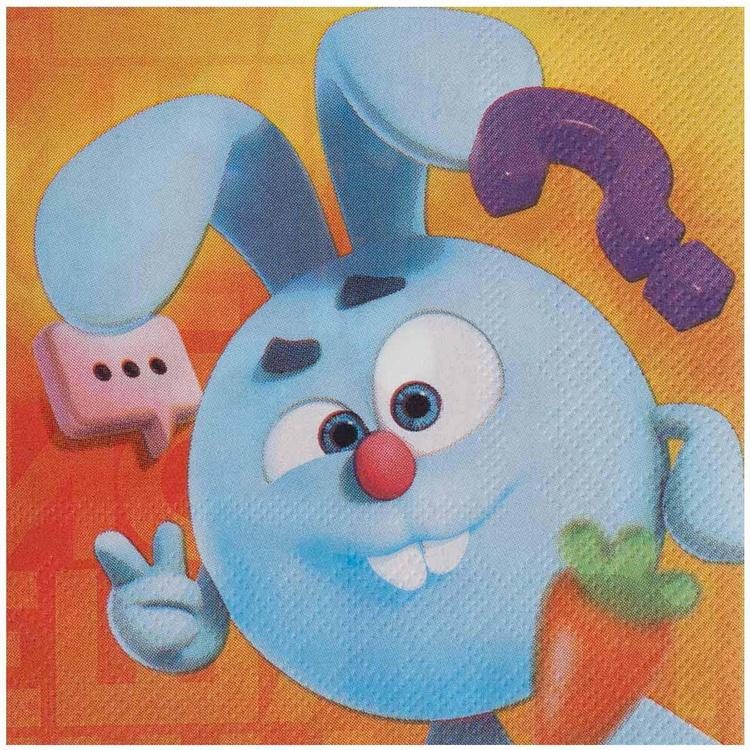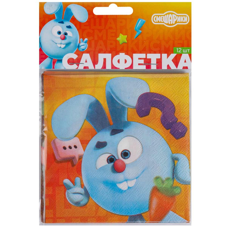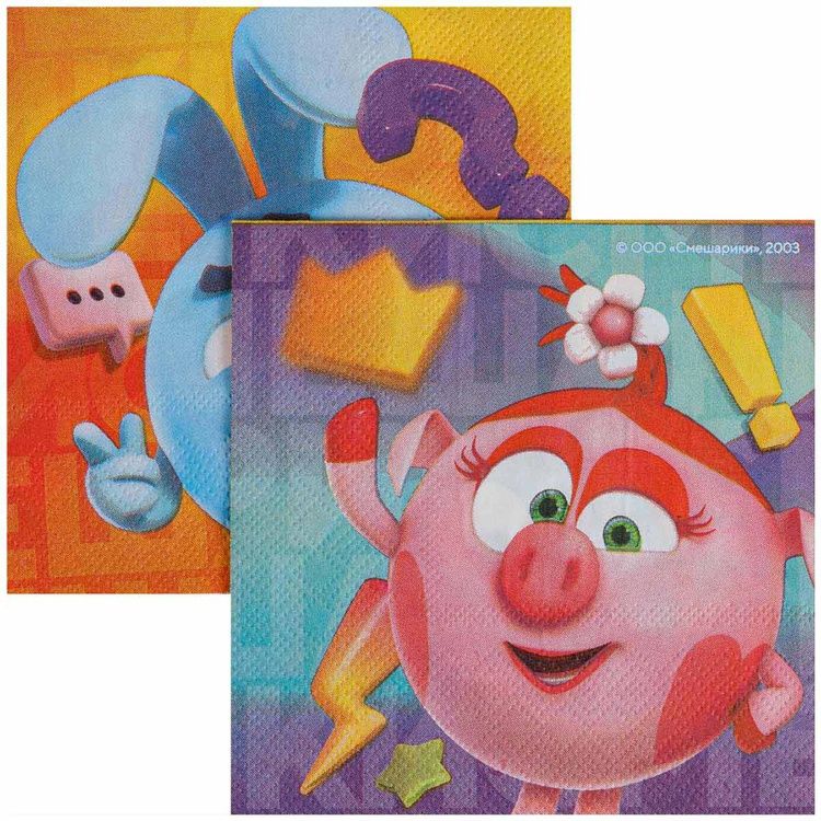 Двухслойная квадратная салфетка (размер 25 * 25 см). Используется совместно с другими элементами коллекции "Смешарики" как украшение стола или по своему непосредственному назначению. Упаковка содержит 12 салфеток.