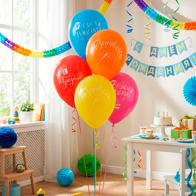 Надписи на шарах: "С Днем рождения", "Поздравляем", "С праздником".