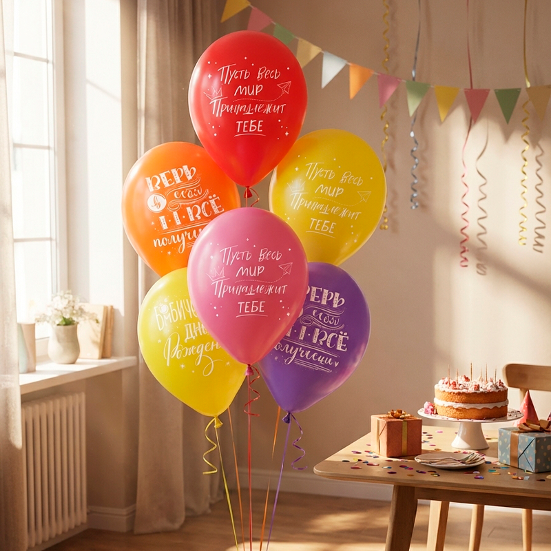 Надписи на шарах: "Верь в себя ты все сможешь", "Бомбического дня рождения", "Пусть весь мир принадлежит тебе".
