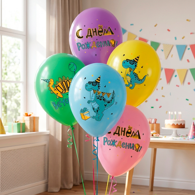 Набор воздушных шаров "С днем рождения, веселые динозавры" с веселыми и модными динозаврами порадуют маленького любителя динозавров и сделают любое мероприятие запоминающимся. Латексные воздушные шары прекрасно подходят для оформления детских праздников, а также могут быть использоваться в качестве самостоятельного подарка.