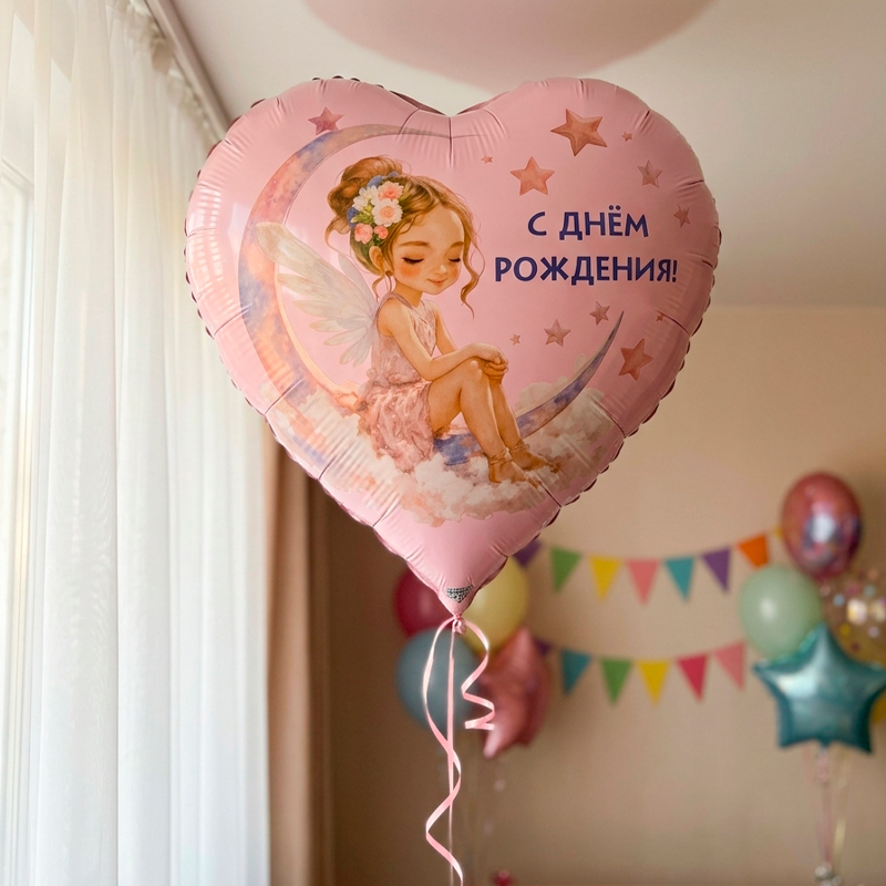 Фольгированный шар размером 18"/ 46см в форме сердца. На нежном розовом фоне застыла волшебная сцена: милая девочка с крылышками, как настоящая фея, беззаботно сидит на полумесяце среди пушистых облаков. Рисунок дополнен теплой поздравительной надписью «С Днем рождения», что делает шар идеальным готовым подарком. Такой шар можно использовать как самостоятельный элемент декора или в воздушном букете в сочетании с другими шарами и украшениями. Рекомендуется надувать гелием — так шар будет держать форму и парить в воздухе, создавая волшебную атмосферу. Имеет встроенный клапан -что упрощает надувание. Размер шара в ненадутом виде 45 см. Изготовлен из качественных материалов (полимерная фольгированная пленка).
