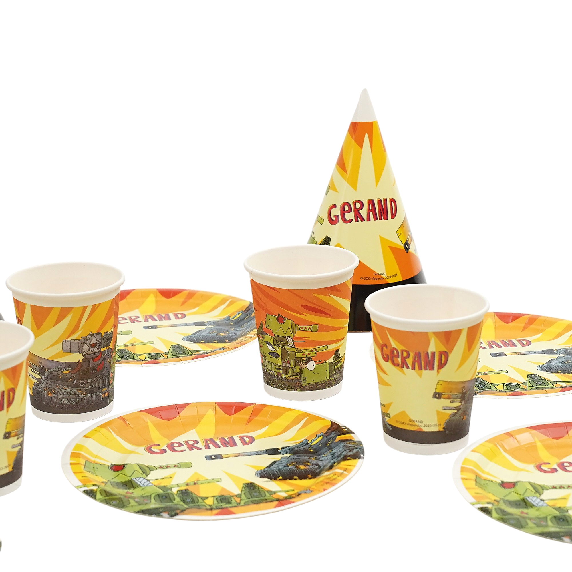 Оформите праздничный стол в стиле мультсериала «Gerand». Коллекция посуды представлена яркими тарелками и стаканчиками, для фото можно взять гудки и надеть праздничные колпачки.