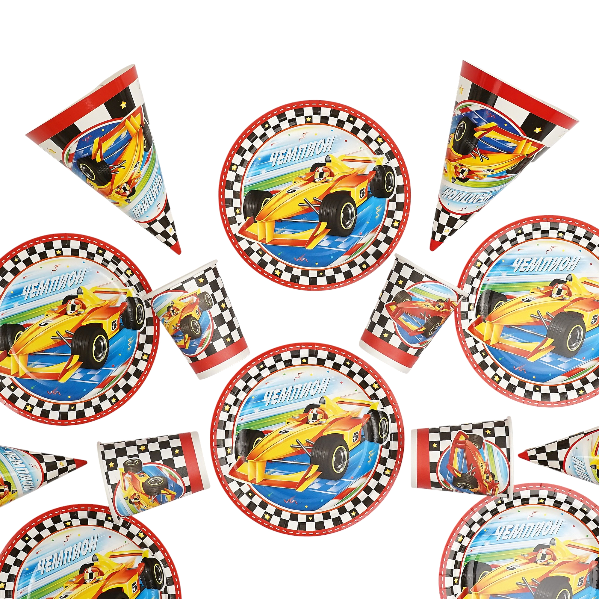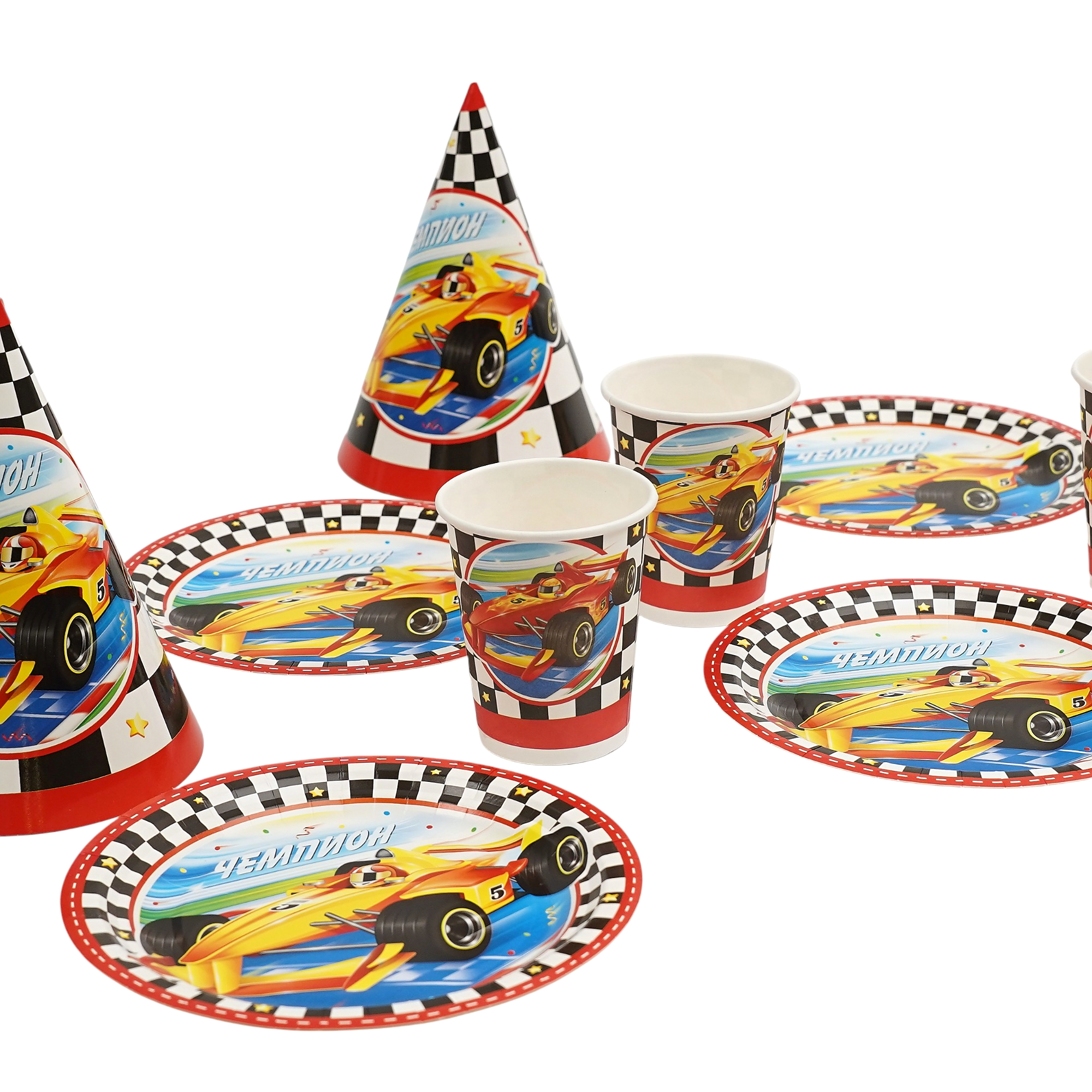Оформите праздничный стол в стиле Тачки Чемпион. Коллекция посуды представлена яркими тарелками и стаканчиками, салфетками, скатертью, для фото можно надеть праздничные колпачки.