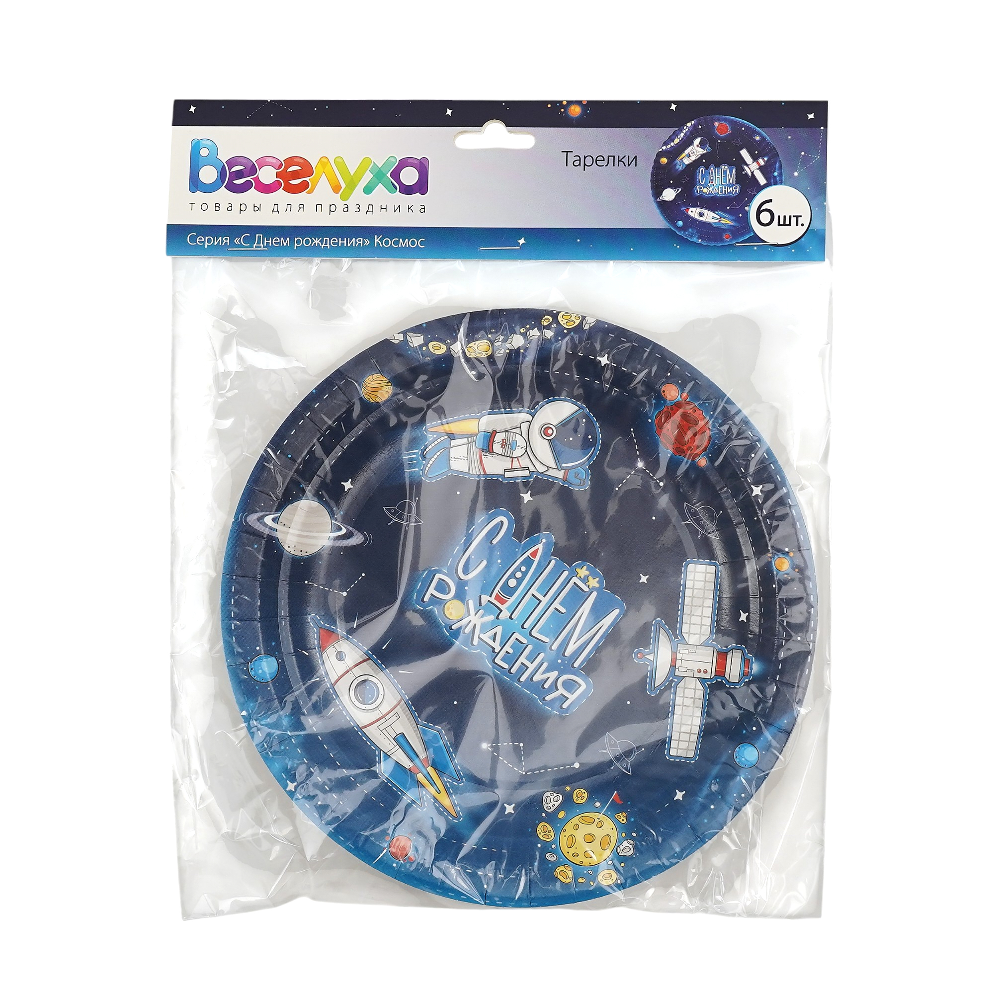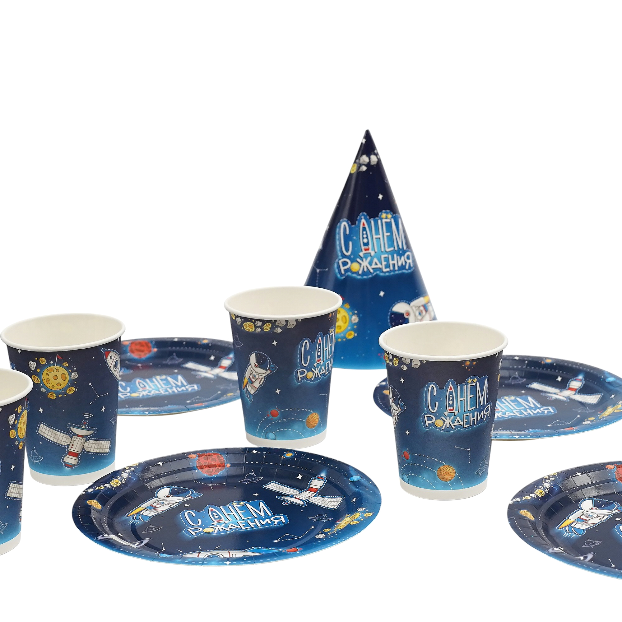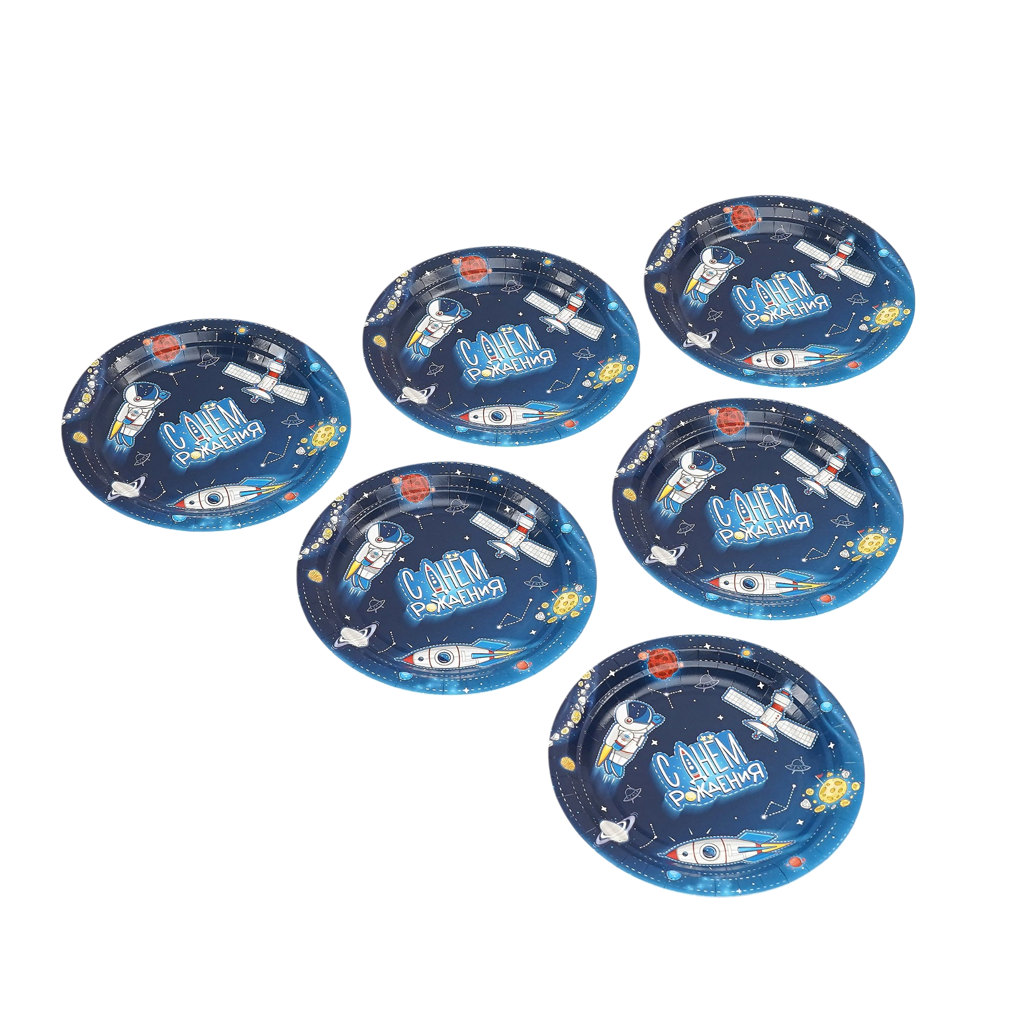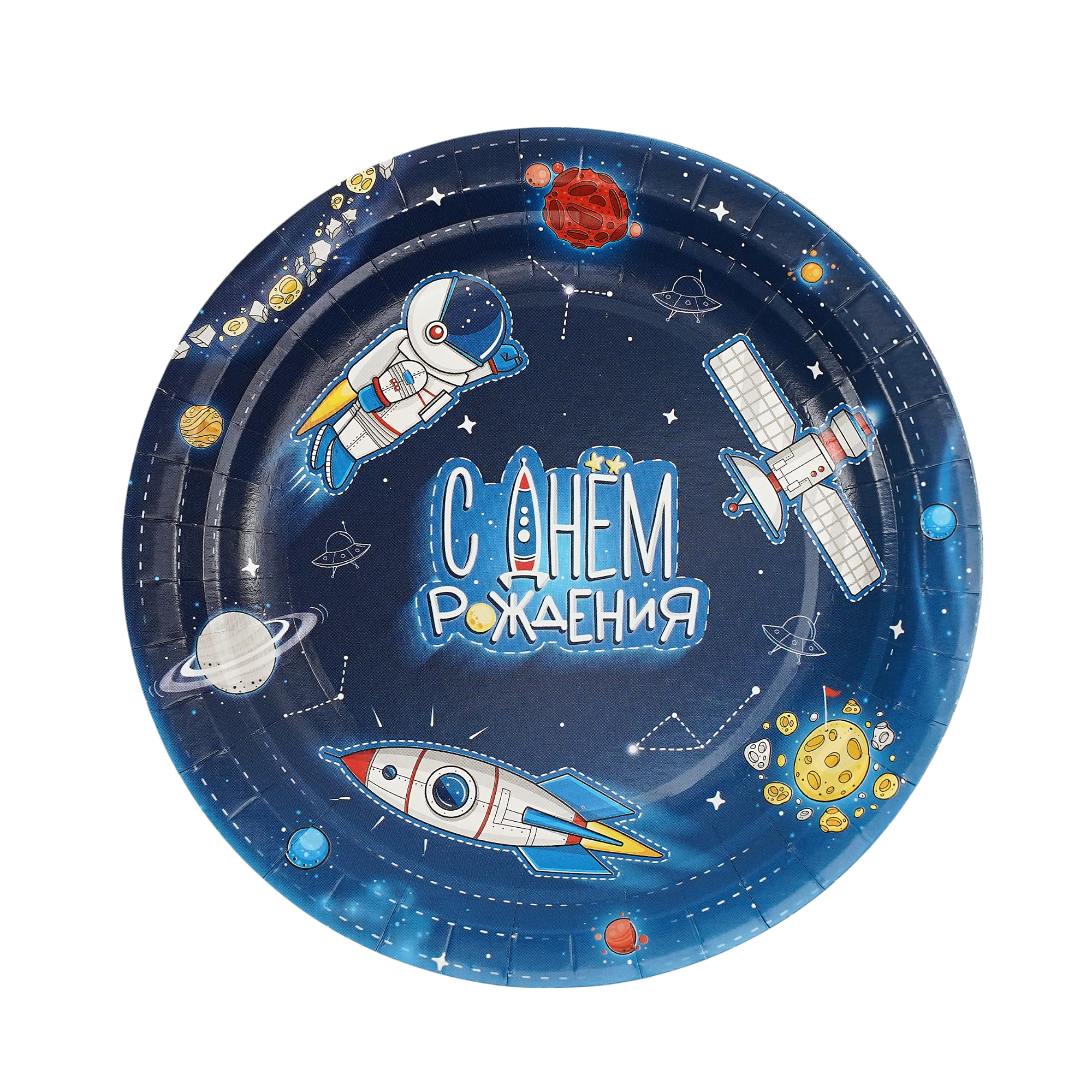 Праздничные тарелки «С Днем рождения» Космос идеально украсят праздничное мероприятие. Тарелки подходят как для холодных, так и горячих блюд.