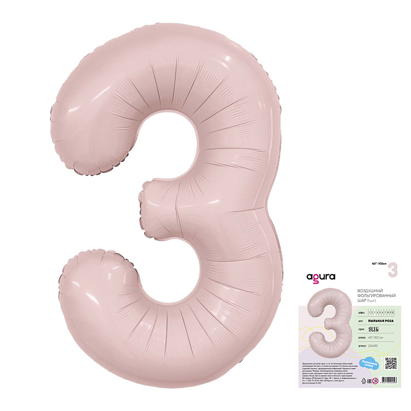 Цифра 3 Пыльная роза SLIM в упаковке, фольгированный шар