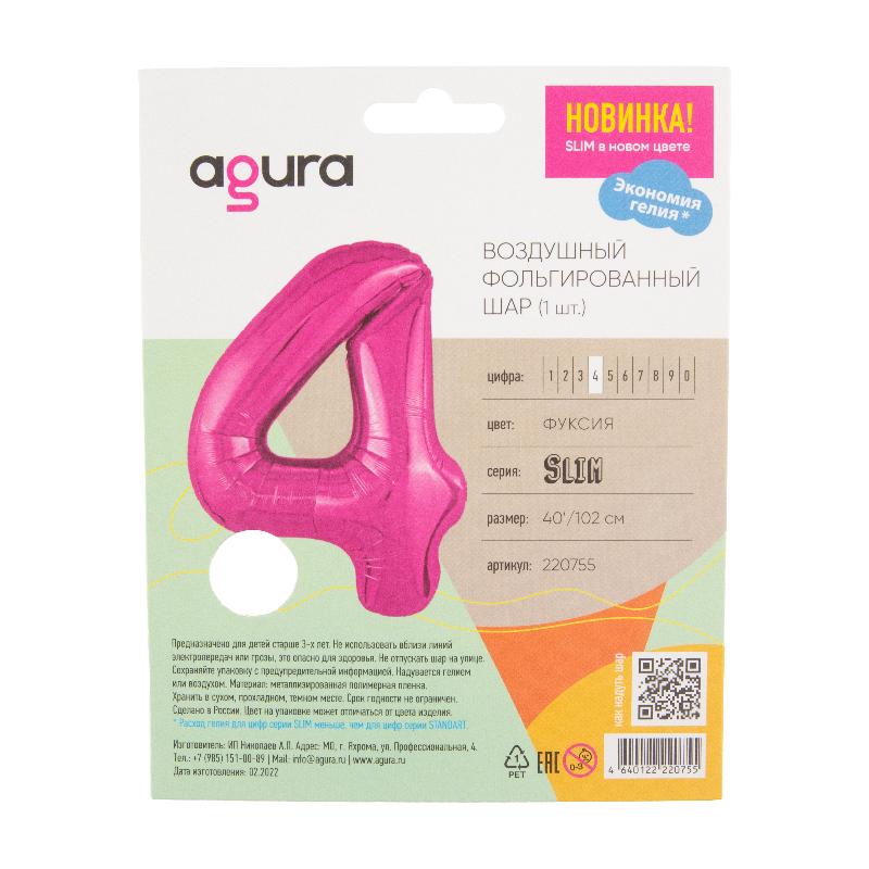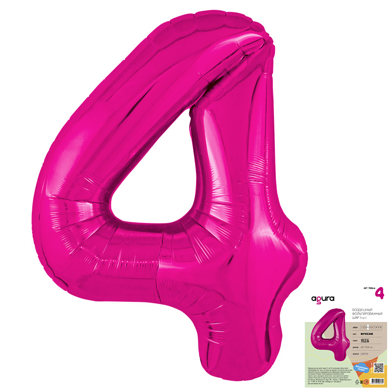 Цифра 4 Фуксия SLIM в упаковке, фольгированный шар