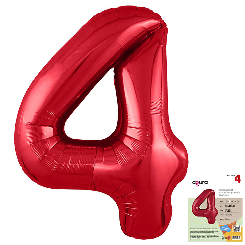 Цифра 4 Красная SLIM в упаковке, фольгированный шар