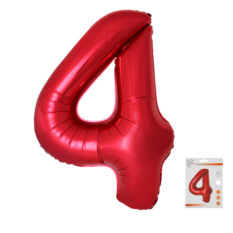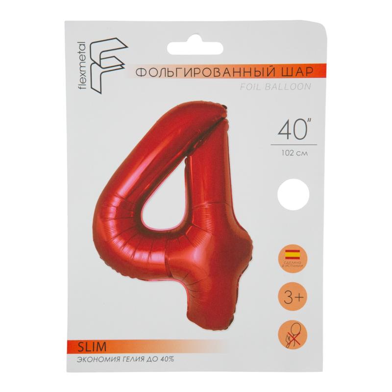 Цифра 4 Красный SLIM в упаковке, фольгированные шары