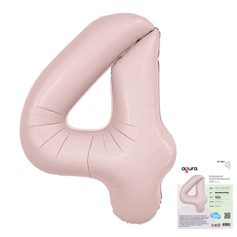 Цифра 4 Пыльная роза SLIM в упаковке, фольгированный шар