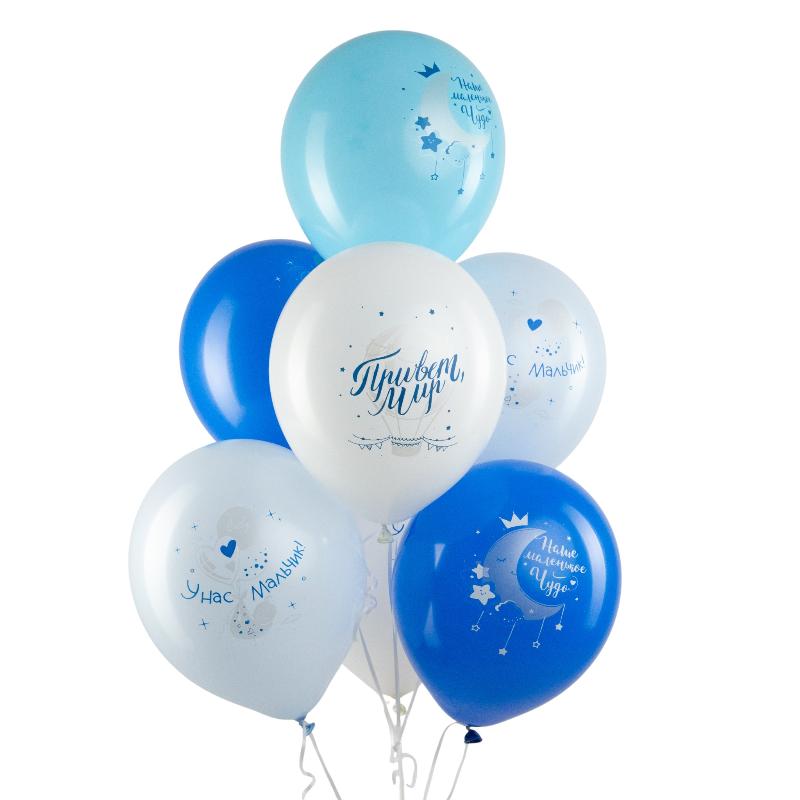 Надписи на воздушных шарах: "Наше маленькое чудо", "Привет, мир", "У нас мальчик!".
