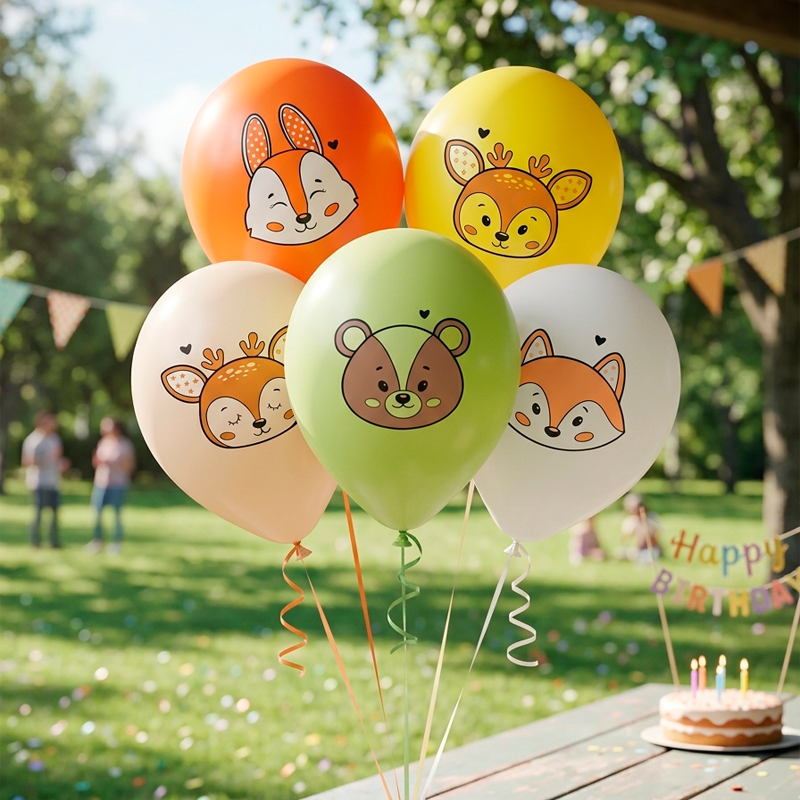 На шарах изображены милые герои леса: заяц, медведь, лисенок, олень