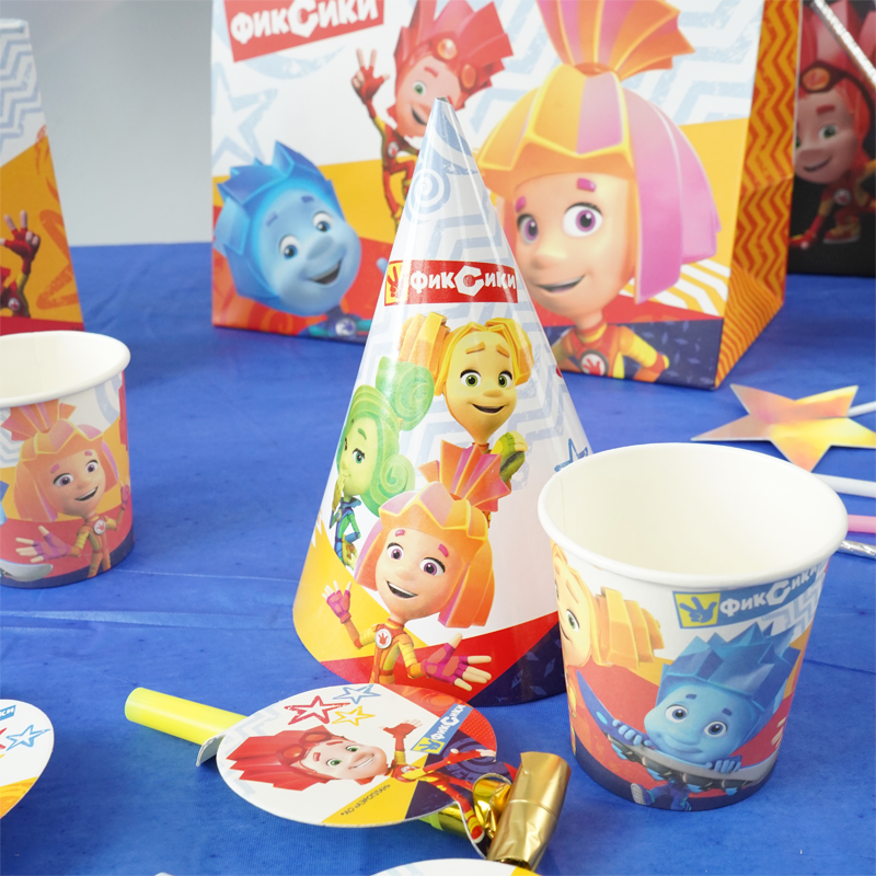 Оформите праздничный стол в стиле мультсериала «Фиксики». Коллекция посуды представлена яркими тарелками и стаканчики, салфетками, скатертью, для фото можно взять гудки и надеть праздничные колпачки.