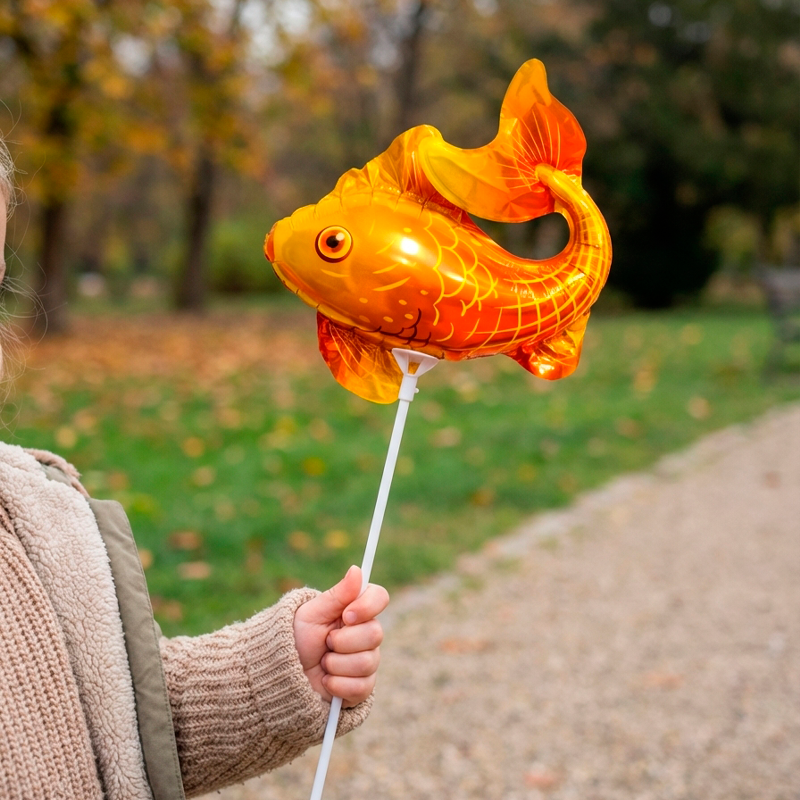 Фольгированный воздушный шар Золотая рыбка мини будет прекрасным самостоятельным подарком, а также дополнит тематическую фотозону или крафт букет.