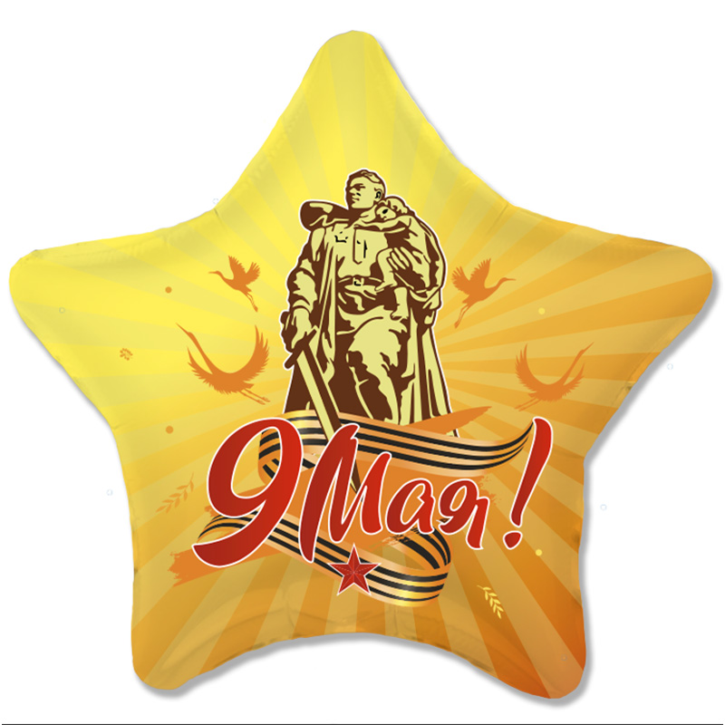 Фольгированный воздушный шар в виде звезды с эксклюзивным дизайном для празднования Великой Победы. Сочетает в себе очень понятные аттрибуты праздника - фигуру Солдата-победителя, несущего на руках ребёнка, меч, победивший врага, георгиевскую ленту - символ Победы и надпись "9 мая". Лучи, исходящие из центра фигуры символизируют героизм защитников отечества, а летящие журавли - это не вернувшиеся с полей солдаты.