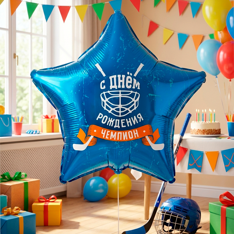 Звезда "С днем рождения, чемпион! Хоккей!" в упаковке, фольгированный шар