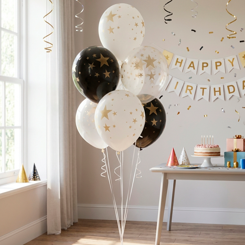 Универсальный дизайн «Звезды» на латексных шарах станут отличным дополнением фонтана из шаров на выпускной в школе или детском саду, День рождения, корпоратив, юбилей, или просто без повода. Вы можете дополнить композицию из фольгированных шаров или использовать оформительские шары для фотозон. Также может использоваться в качестве самостоятельного подарка ребенку.
